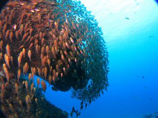 さらなる大きな群れを追い求めて進むと、ぐるぐると編隊を組んだイソマグロの群れが!