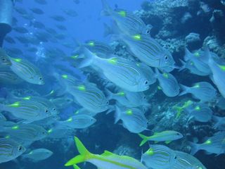 中層でグルクンの群れを眺めていると、足元を悠々とサメが通っていたり。